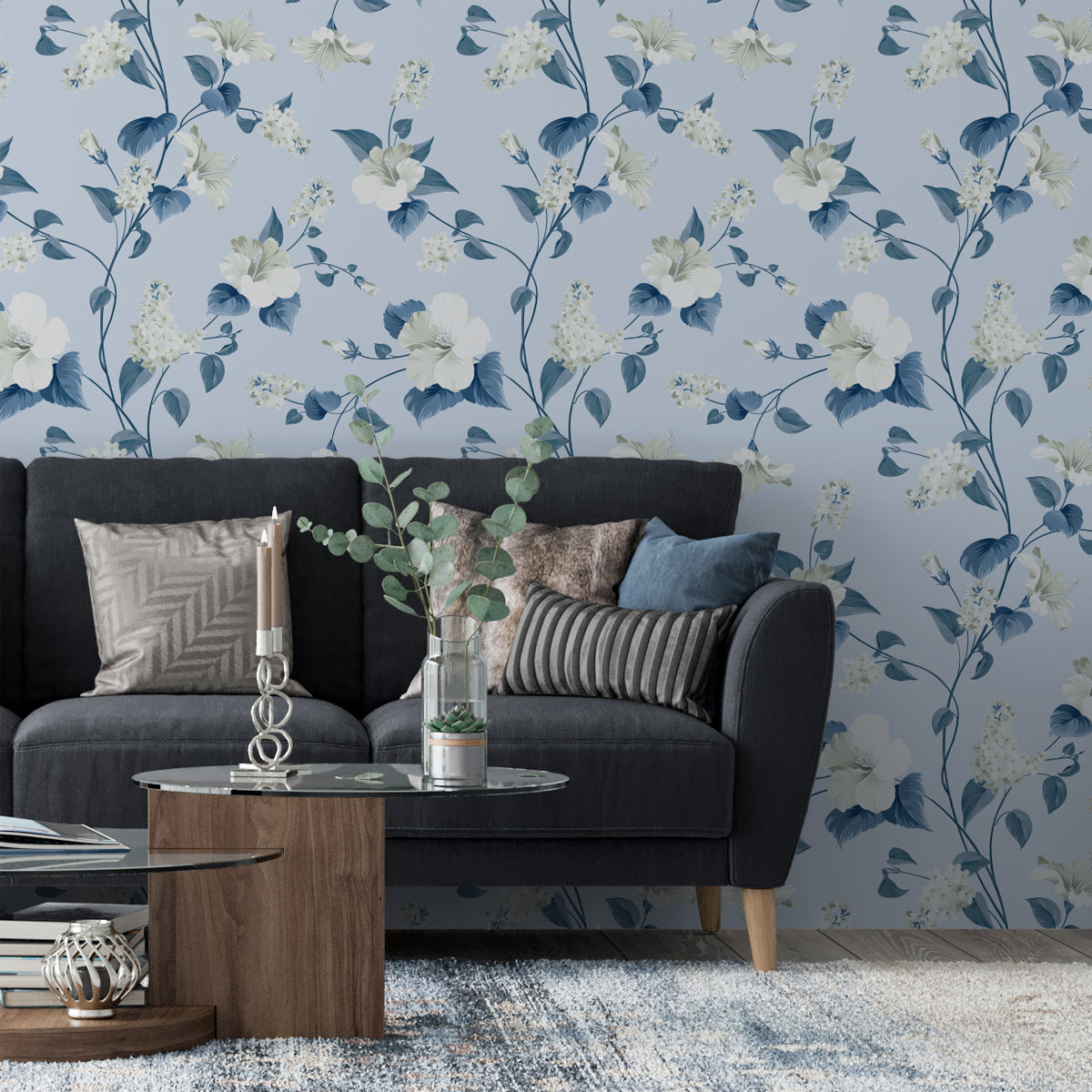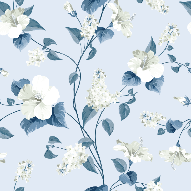 Papel tapiz flores blancas con azul